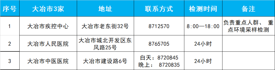 大冶市3家,分别是大冶市疾控中心、大冶市人民医院和大冶市中医医院;