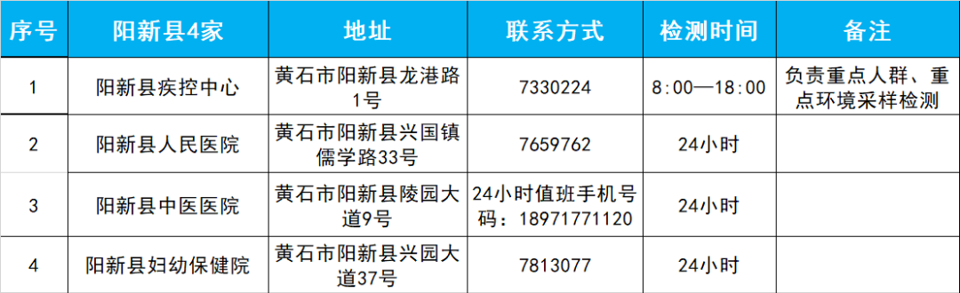 阳新县4家,分别是阳新县疾控中心、阳新县人民医院、阳新县中医医院和阳新县妇幼保健院。