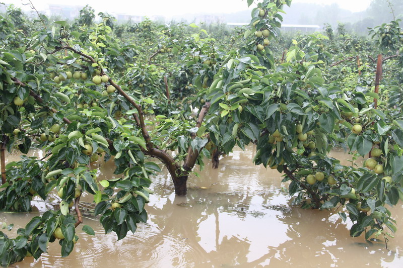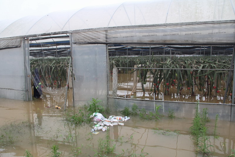 “目前损失最大的是基地200亩蔬菜基本绝收,2016年投资上百万元,种植的80亩大棚火龙果正式进入丰产期,预计今年可收入60万元以上,60多亩梨树上挂满了喜人的果实,同火龙果一样,有35亩被洪水浸泡一米多深,如果再在洪水里泡上一昼夜那损失就不堪设想”基地负责人李群英心急如焚地介绍。