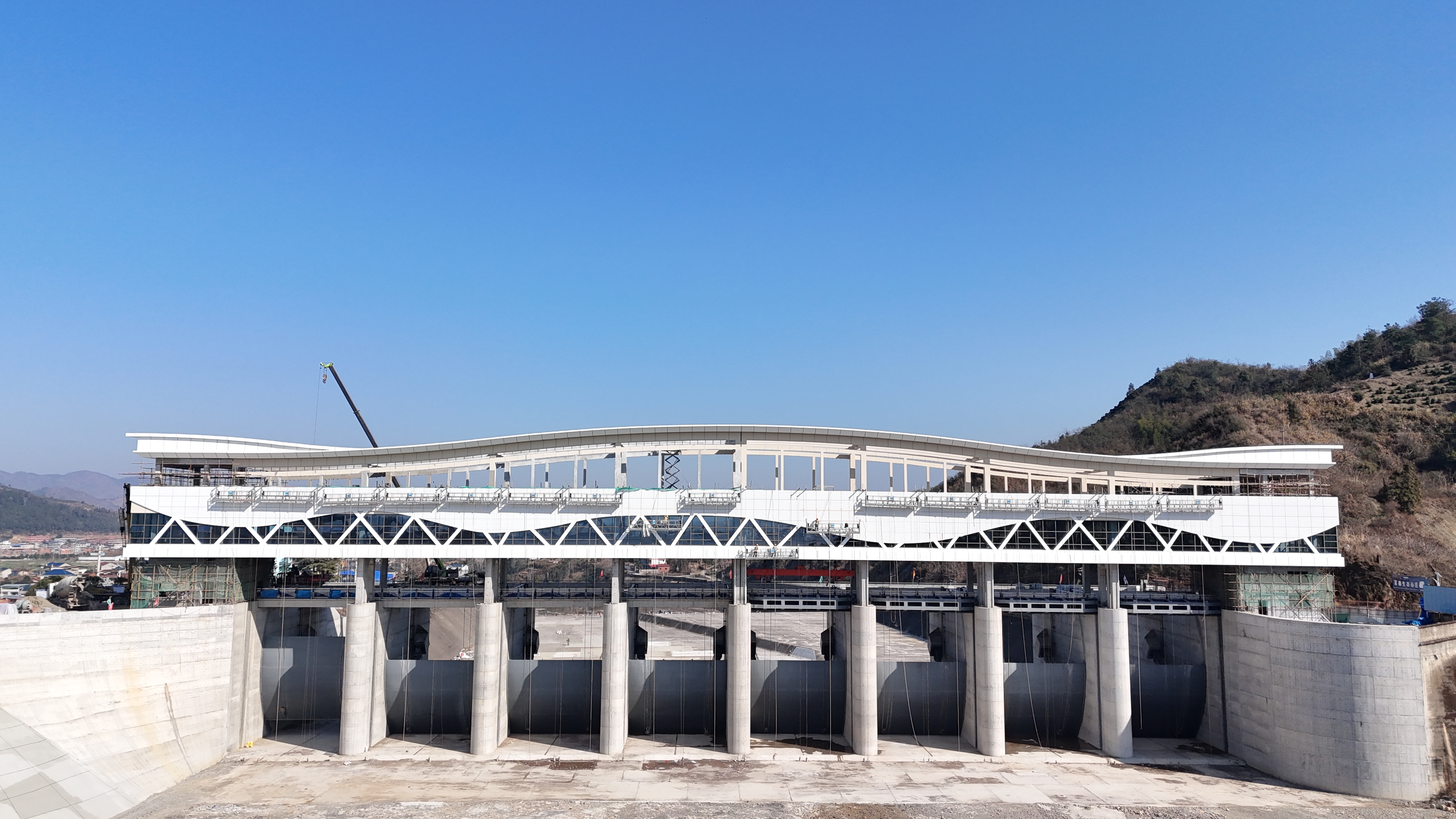 新建启闭机室弧形屋面如银翼舒展,白色幕墙与几何桁架相映,勾勒出刚柔相济的现代轮廓,在阳光下熠熠生辉。